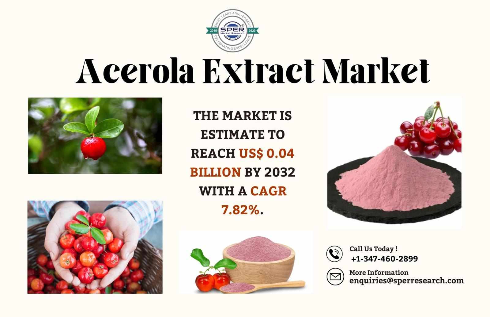 According to SPER Market Research, 'Acerola Extract Market Size- By Form, By Application, By Nature, By Distribution Channel- Regional Outlook, Competitive Strategies and Segment Forecast to 2032' states that the Global Acerola extract market is estimated to reach USD 0.04 billion by 2032 with a CAGR of 7.82%.