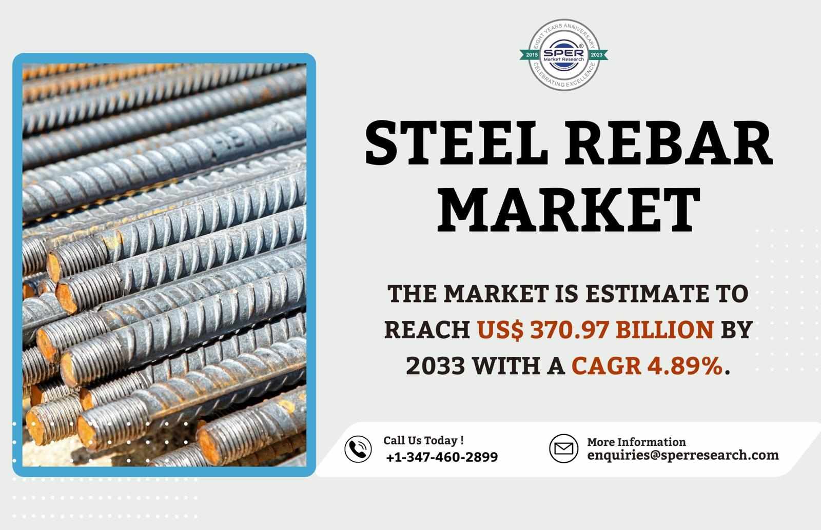 According to SPER Market Research, ‘Steel Rebar Market Size- By Type, By Coating Type, By Bar Size Type, By Process Type, By End Use Sector - Regional Outlook, Competitive Strategies and Segment Forecast to 2033' states that the Global Steel Rebar market is estimated to reach USD 370.97 billion by 2033 with a CAGR of 4.89%.