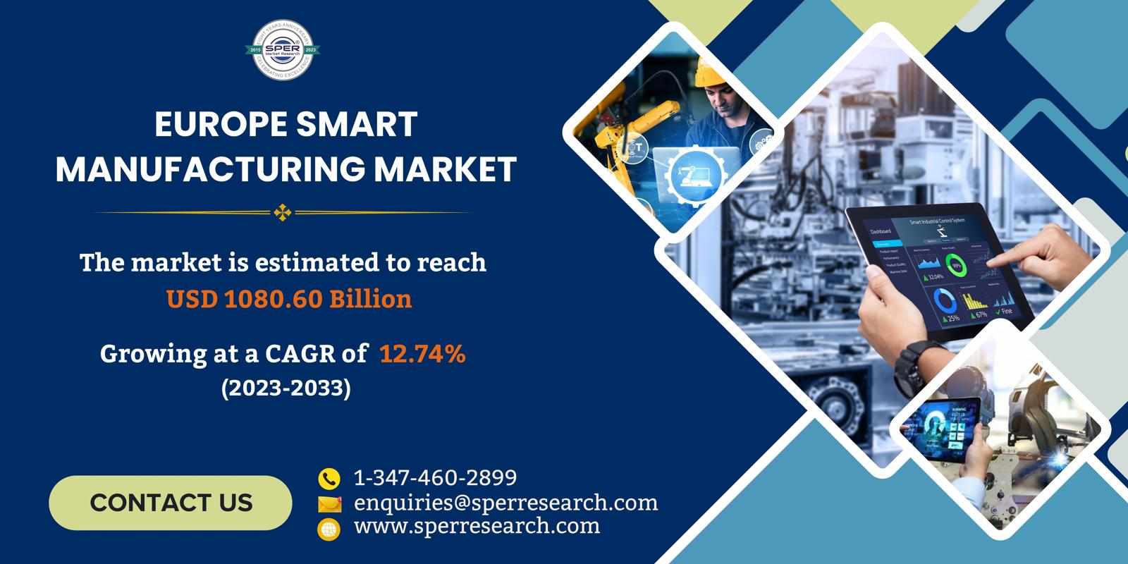 According to SPER Market Research, ‘Europe Smart Manufacturing Market Size- By Component, By Deployment, By Enterprise Size, By End User- Regional Outlook, Competitive Strategies and Segment Forecast to 2033’ states that the Europe Smart Manufacturing Market is estimated to reach USD 1080.60 billion by 2033 with a CAGR of 12.74%.